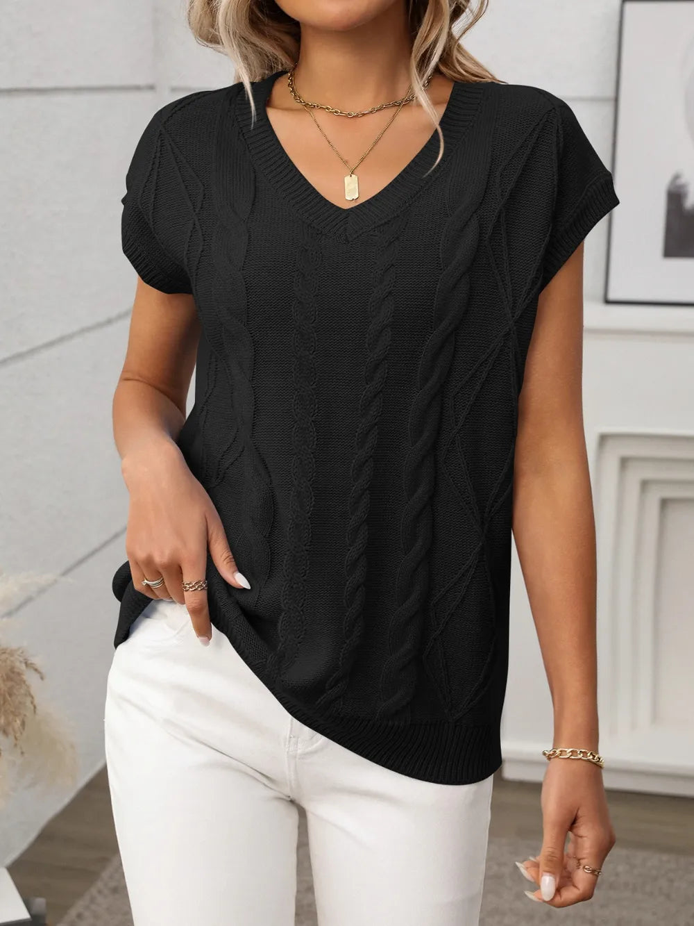 Blusa de malha com decote em V e manga curta